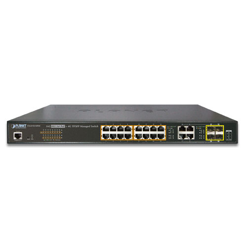 A Perfect PoE+ Managed Switch with Advanced L2/L4 Switching and Security The GS-4210-16P4C is a new generation of PLANET Gigabit PoE+ Managed Switch series featuring PLANET intelligent PoE functions to improve the availability of critical business applications. It provides IPv6/IPv4 dual stack management and built-in L2/L4 Gigabit switching engine along with 16 10/100/1000BASE-T ports featuring 30-watt 802.3at PoE+ and 4 additional Gigabit TP/SFP combo ports. With a total power budget of up to 220 watts for different kinds of PoE applications, the GS-4210-16P4C provides a quick, safe and cost-effective Power over Ethernet network solution for small businesses and enterprises.